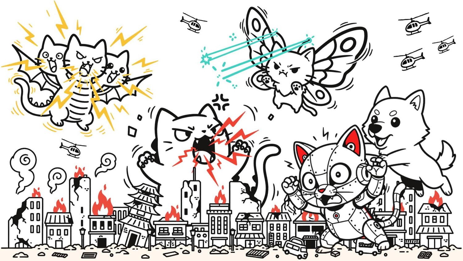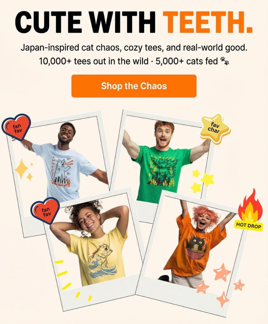 We're two lifelong anime nerds, cat people, and co-creators of the Kyattojira Universe. What started as doodles of a hungry cat became a full saga β and now, a mission to feed real rescue cats with every order. We're in this with you, one tee at a time.