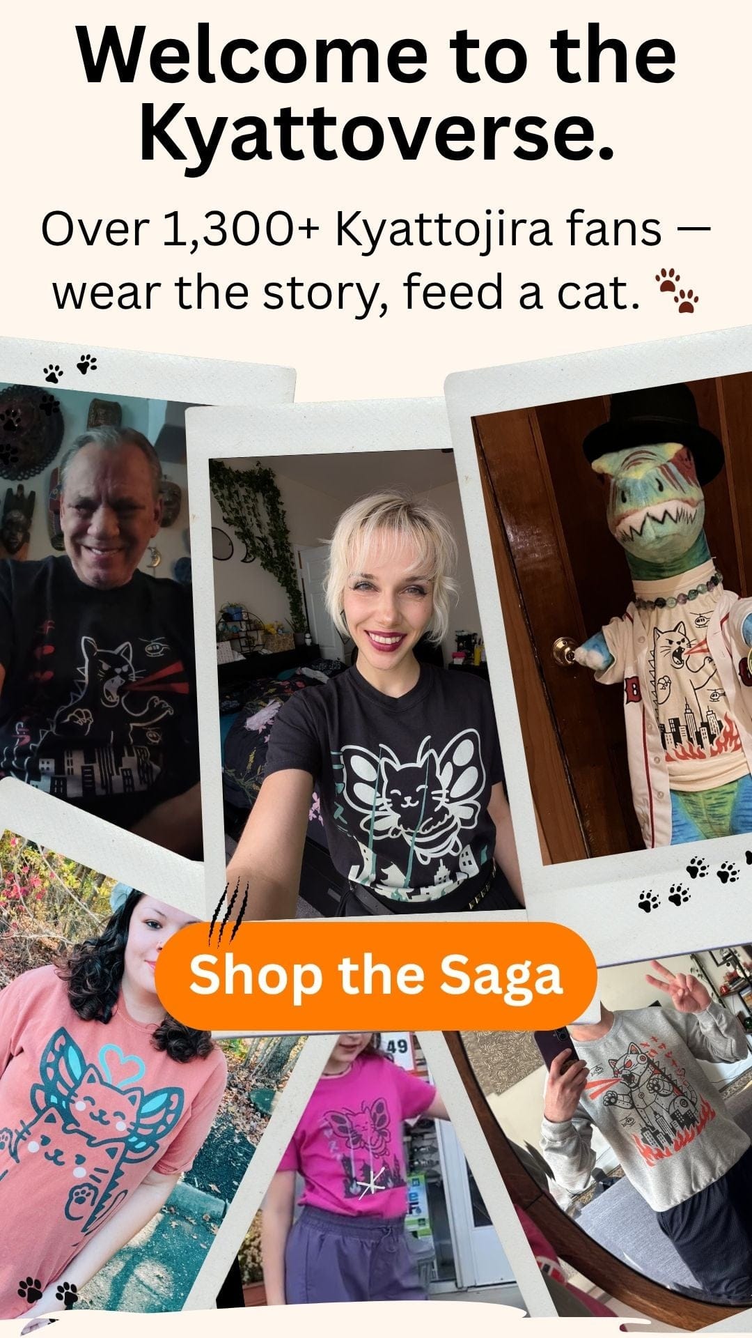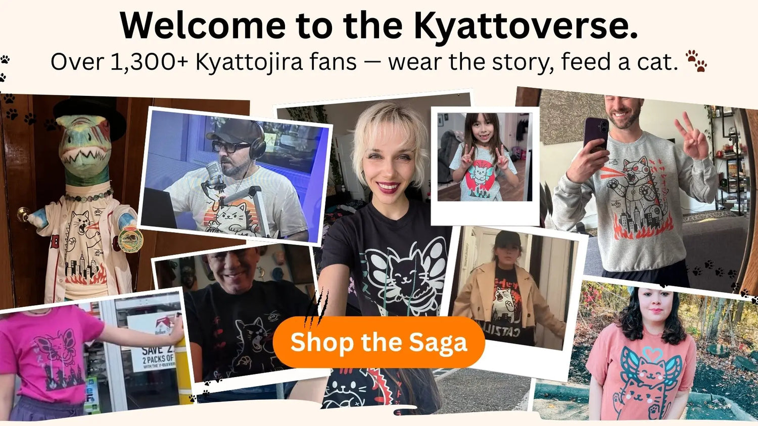 We're two lifelong anime nerds, cat people, and co-creators of the Kyattojira Universe. What started as doodles of a hungry cat became a full saga — and now, a mission to feed real rescue cats with every order. We're in this with you, one tee at a time.